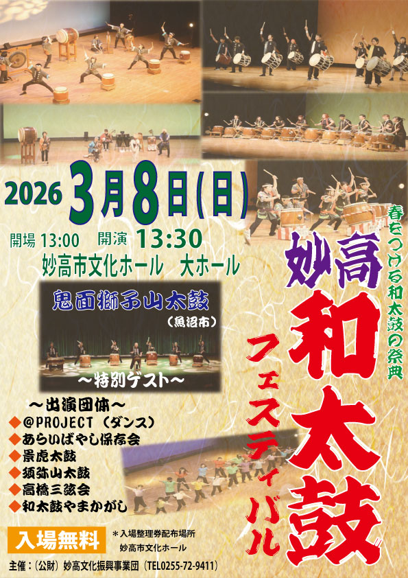市内6団体+ゲスト・鬼面獅子山太鼓(魚沼市)による春を告げる和太鼓の祭典!