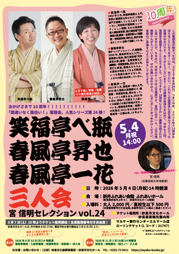 まさに垂涎のメンバーが今年も揃いました!爆笑トークコーナーも好評の宮信明さん選りすぐりの芸人さんによる「間違いなく面白い!」落語会。人気シリーズ第24弾は、この落語会では初めての上方落語家・笑福亭べ瓶さん、お馴染みの春風亭昇也さん、9月に単独・抜擢での真打昇進が決まっている春風亭一花さんがゴールデンウィークの妙高に登場!お聴き逃しなく!